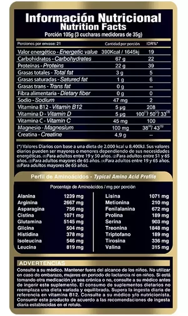 GAINER GOLD ha logrado un avance importante en carbohidratos saludables con su fórmula Complex Carbs en su proporción 3:1, es una fuente de energía limpia y sostenida. Con beneficios especialmente notables para personas con problemas para digerir otras proteínas.
